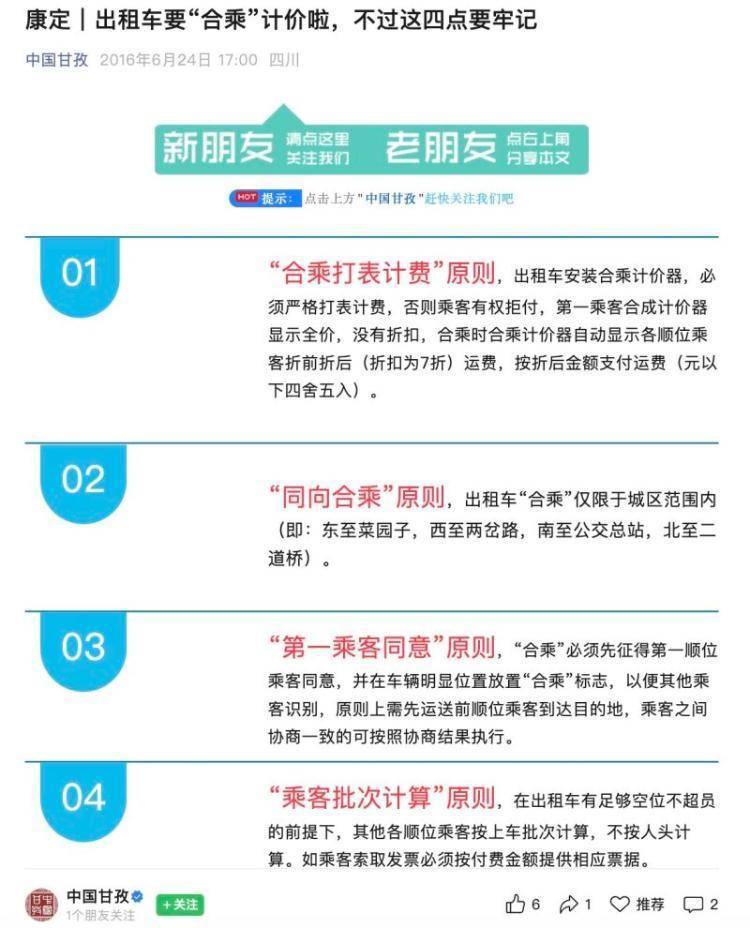 据甘孜州政府官方公众号“中国甘孜”2016年6月发布的信息显示,出租车合乘仅限康定市城区范围内。合乘车辆必须安装专用计价器并严格打表收费,否则乘客有权拒付。计价规则为:第一乘客合成计价器显示全价,没有折扣,合乘时合乘计价器自动显示各顺位乘客折前折后(折扣为7折)运费,并按折后金额支付运费。