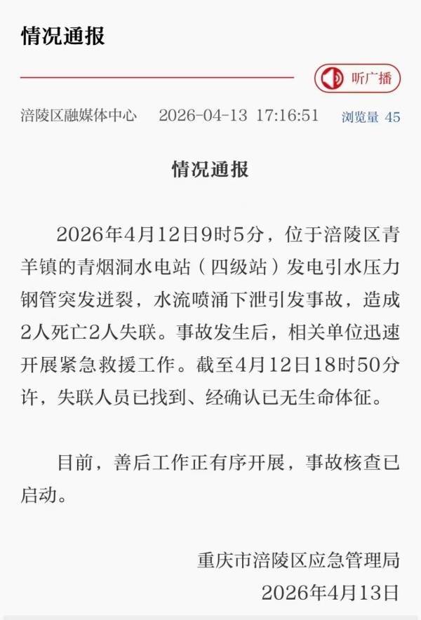 2026年4月12日9时5分,位于涪陵区青羊镇的青烟洞水电站(四级站)发电引水压力钢管突发迸裂,水流喷涌下泄引发事故,造成2人死亡2人失联。事故发生后,相关单位迅速开展紧急救援工作。截至4月12日18时50分许,失联人员已找到、经确认已无生命体征。