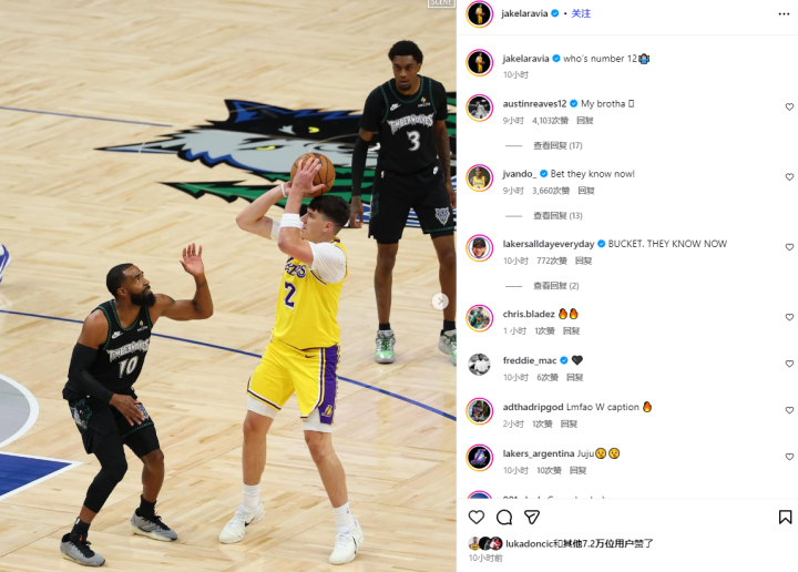 东契奇点赞力挺拉拉维亚,湖人其他球员在评论区互动——
