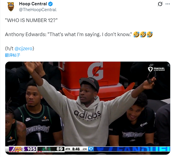 第四节镜头给到拉拉维亚,森林狼主场的球迷集体大喊:“这12号是谁?”;因伤缺阵穿着便装的爱德华兹跟着起哄,并且说道:“这也是我想问的!我也不认识。”